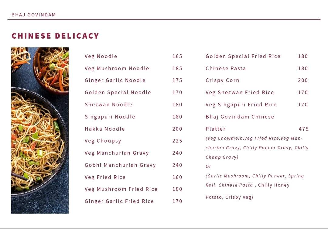 Escape into a culinary haven where Bhaj Govindam Restaurant and Bakery beckons you with its alluring ambiance and delectable delights. From the tantalizing aroma of our Hot and Sour soup to the crispy indulgence of our Dry Chilly Paneer, each dish is a masterpiece crafted with love and precision. Savor the creamy perfection of our Mushroom Curry, complemented by the aromatic warmth of Tandoori Roti. Indulge in the rich, velvety texture of our Dal Makhani, a testament to our culinary prowess. Finish your feast on a sweet note with our irresistible Butter Scotch Ice Cream and the heavenly Nawabi Halwa, leaving you with memories that will linger long after your meal.